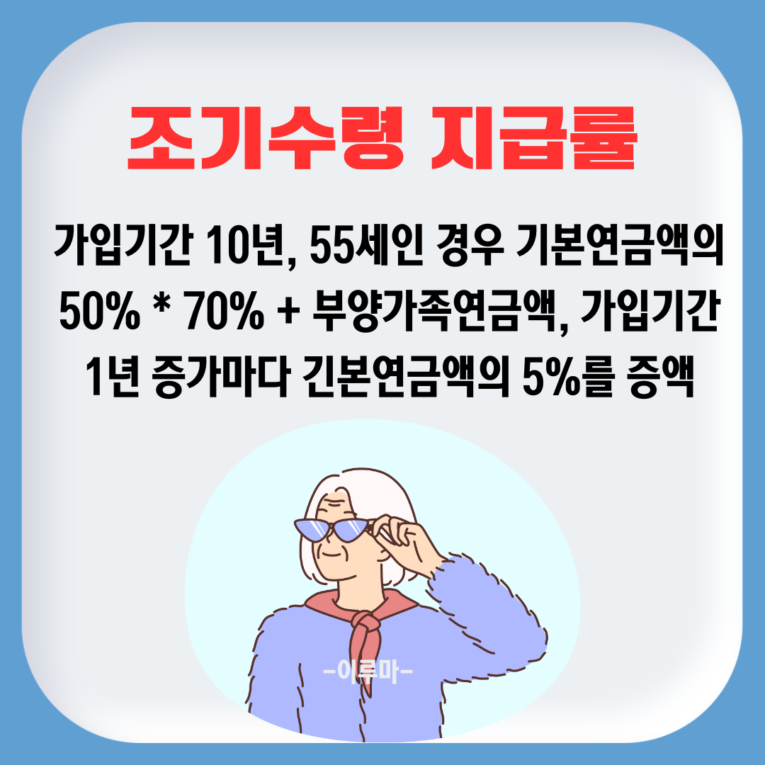🔹국민연금 조기수령 국민연금 가입자는 만 55세부터 조기노령연금을 신청할 수 있습니다.