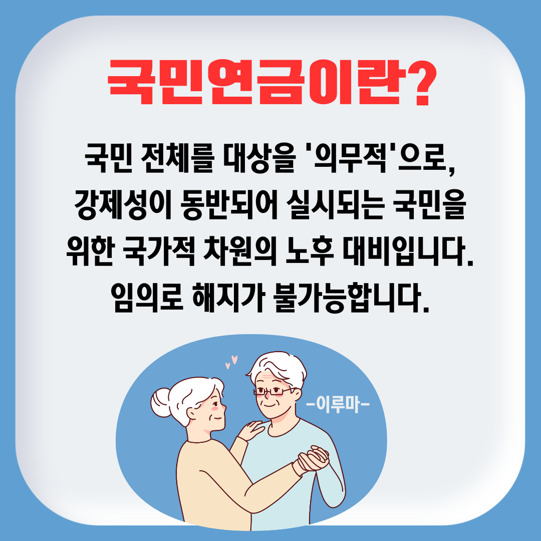 ✅ 국민연금은 정부가 운영하고 있는 연금제도로서 만 18세 이상이며 60세 미만 국내 거주 국민이라면 소득이 있을 때 연금을 납부해야 합니다. 국민연금은 갑작스런 질병이나 사망, 장애가 있을 때 소득이 중단되는 경우 연금을 지급받아 기본생활 유지에 도움을 주는 제도입니다.