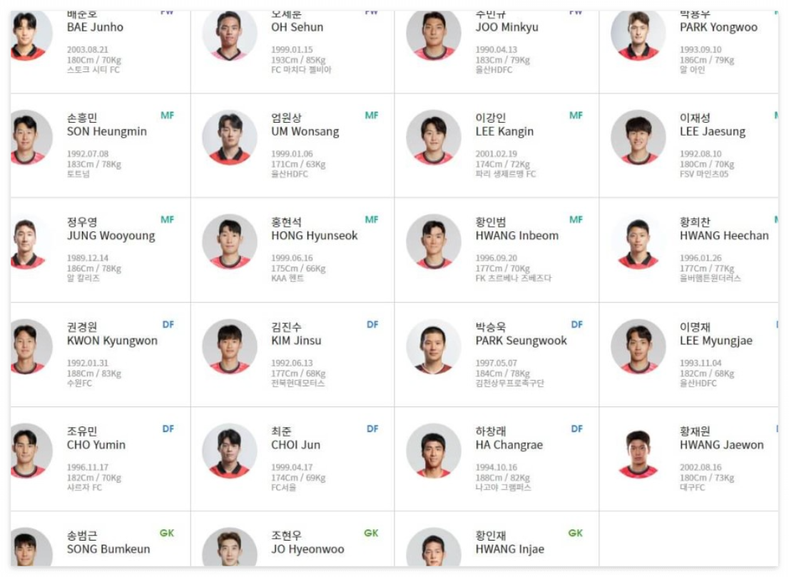 ✅MF:박용우, 정우영, 황인범, 홍현석, 배준호, 이재성, 손흥민, 황희찬, 엄원상, 이강인